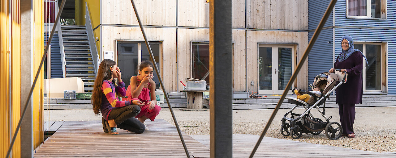 Der Aussenraum von FOGO mit dem attraktiven Spielplatz ist öffentlich zugänglich. Im Kursgebäude bietet die AOZ Alphabetisierungs- und Deutschkurse mit Kinderbetreuung an.